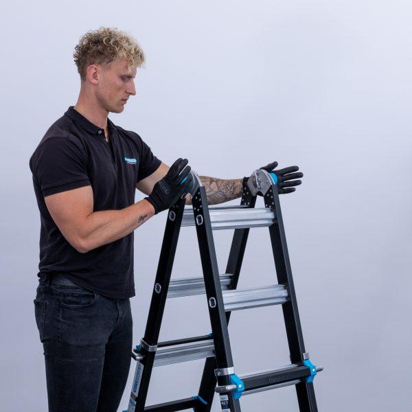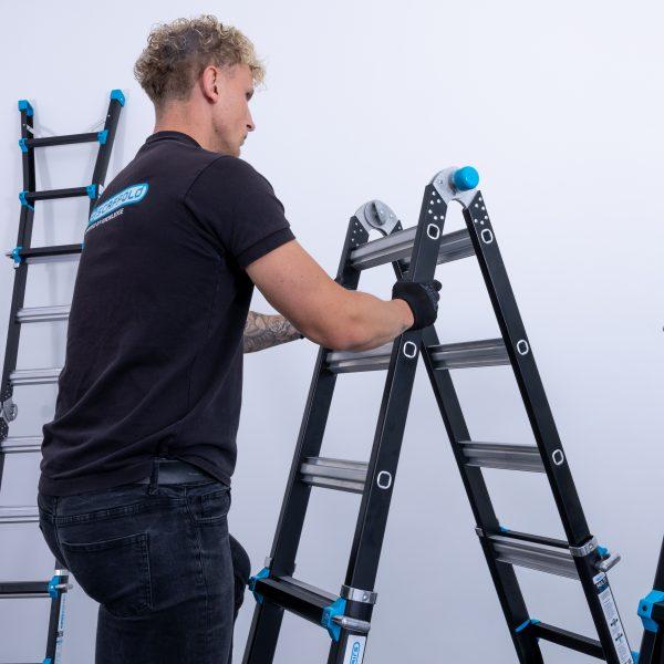 Dank der klappbaren Konstruktion lässt sich die Leiter einfach umstellen und an unterschiedliche Arbeitssituationen anpassen – sei es auf Treppen, in engen Räumen oder an schwer zugänglichen Stellen. Die Leiter erfüllt die Normen EN131 und NEN2484, was höchste Sicherheitsstandards garantiert.